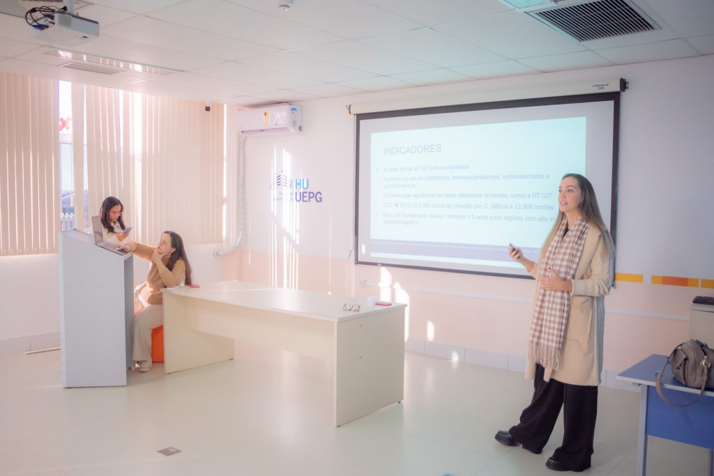 “Clostridioides difficile é um bacilo gram-positivo anaeróbio formador de esporos o qual ocasiona persistência em humanos e no meio ambiente por longos períodos”, afirma a enfermeira Bruna, que ministrou a palestra durante o evento em conjunto com a médica Gabriela e a farmacêutica Larissa. Segundo ela, as principais medidas de prevenção e controle de disseminação são: controle no uso de antimicrobianos, buscas ativas, precaução de contato em casos de suspeita/confirmação, limpeza e desinfecção de superfícies e equipamentos contaminados, avaliar diariamente o quadro clínico do paciente, e e iniciar o tratamento conforme protocolo institucional e discussão com o(a) médico(a) infectologista.